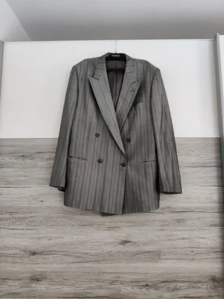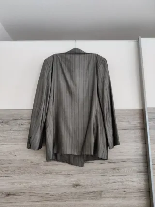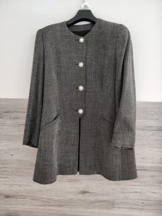 Elegante completo composto da gonna e blazer. - Blazer con chiusura a bottoni. - Dettagli con bottoni gioiello. - Tasche applicate sul blazer. - Tessuto fantasia grigio e bianco. Ma purtroppo con alcuni segni di usura sull blazer (mostrate nelle fotografie) , la gonna non ha dettagli, il blazer e L' e la gonna XL , qualsiasi domanda o offerta contattami