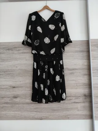 Elegante abito con stampa a foglie. - Fantasia foglie bianche su fondo nero. - Design a due pezzi con top e gonna plissettata. - Dettaglio perline in vita.
