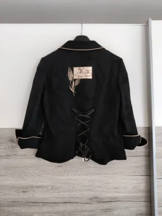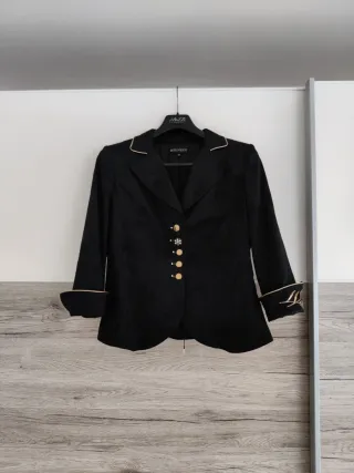 Elegante blazer Monica Magni, perfetto per completare un outfit sofisticato. Tutte due sono taglia L - Dettagli con bordino dorato su colletto e polsini. - Chiusura con bottoni dorati. - Decorazioni a forma di fiore con perle sui bottoni. - Taglio sagomato con fondo a punta.