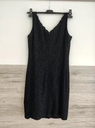 Elegante abito da donna in pizzo, lungo al ginocchio, completamente foderato, tranne le maniche. Usato una volta, veste regolare - Maniche lunghe. - Dettaglio in vita. - Chiusura a zip sul retro.
