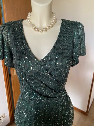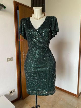 Nuovo mai usato, in vendita x cambio taglia, lunghezza sotto ginocchio, avvolgente, girocollo, cerniera dietro, leggermente elasticizzato, perfetto per diverse occasioni. - Tessuto satinato lucido. - Taglio dritto. - Senza maniche.