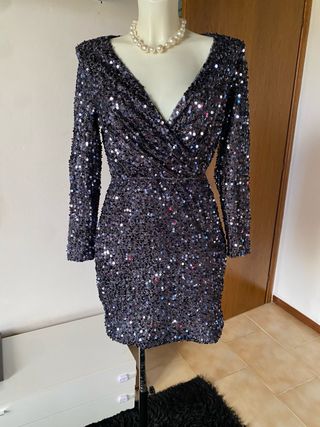 Elegante mini abito interamente ricoperto di paillettes che creano un gioco di luci e colori. - Maniche lunghe. - Scollo a V. - Vestibilità aderente.