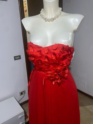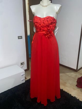 Elegante abito lungo di colore rosso, perfetto per occasioni speciali. - Corpetto decorato con applicazioni floreali. - Cintura in vita con fiore applicato. - Gonna ampia in tessuto leggero.
