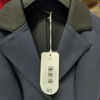 Giacca da concorso Equestro in colore blu. Presenta un design elegante e raffinato. - Collo in velluto a contrasto. - Chiusura a due bottoni. - Tasche con profilo in ecopelle.