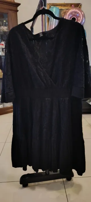 Nuovo mai usato x cambio taglia, tessuto tipo pizzo macramè con fodera in crepella beige a contrasto, maniche 3/4, cerniera dietro, leggermente svasato Tessuto esterno effetto pizzo. Foderato internamente in crepella beige.