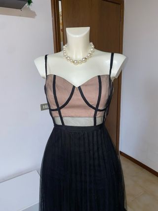 Elegante abito lungo nero con dettagli in tulle e corpino a contrasto. - Tessuto in tulle leggero e fluttuante. - Corpino con struttura a balconcino e inserti. - Gonna lunga con multistrato di tulle.