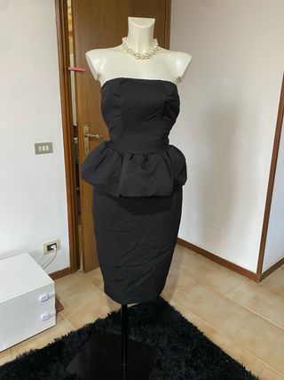 Elegante abito midi nero, perfetto per ogni occasione. - Design senza spalline. - Gonna a tubino. - Dettaglio peplo in vita.