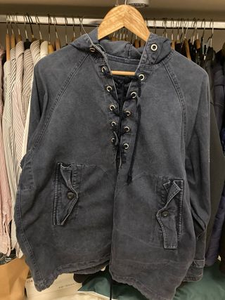 Giacca con cappuccio e laccetto frontale. - Design con cappuccio. - Chiusura con lacci e occhielli. - Tasche frontali con bottone.