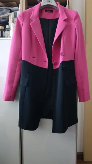Elegante abito blazer bicolore. - Parte superiore rosa acceso. - Parte inferiore nera. - Design a doppio petto con bottoni.