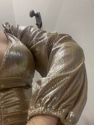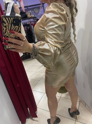 Elegante vestito color oro, nuovo. - Tessuto con una texture luminosa. - Maniche lunghe a sbuffo. - Dettaglio drappeggiato sul fianco.