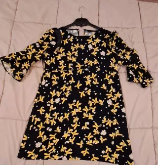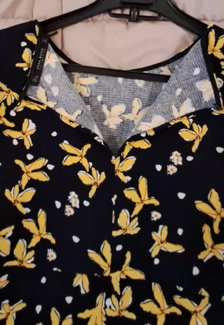 Vestito da donna con una vivace fantasia floreale. - Tessuto leggero e confortevole. - Scollo con dettaglio a balza. - Maniche corte. - Motivo di fiori gialli su fondo blu scuro. ZARA Ascella 48 cm Lunghezza 80 cm Larghezza bassa 56 cm