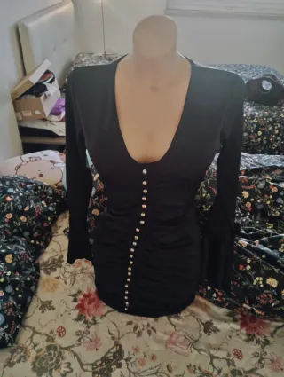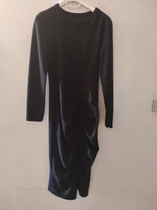 Elegante vestito nero con dettagli che lo rendono unico. - Scollo a V. - Maniche lunghe a campana. - Tessuto arricciato sul davanti. Provato solo una volta.