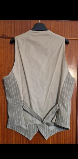Gilet da uomo con un design a righe verticali. - Fantasia a righe bianche su fondo beige. - Chiusura con bottoni. - Taschino sul petto con catenella. - Due tasche frontali. - Fodera interna.