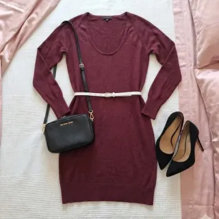 Abitino in maglia Sisley color magenta scuro, semplice e super femminile. Scollo rotondo ampio, maniche lunghe e linea dritta che puoi lasciare morbida oppure stringere con una cintura (in foto l’ho messo con una cintura chiara ma non è compresa). Maglia invernale, medio-spessa, morbida sulla pelle. Perfetto con collant e décolleté o anche con stivaletti.
