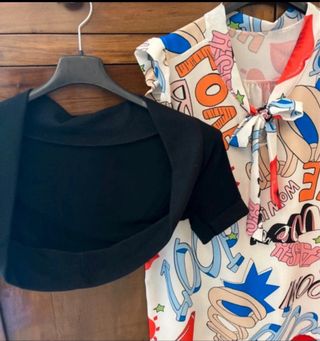 Set estivo da donna composto da tre pezzi. - Top con stampa grafica e fiocco. - Bolerino nero a maniche corte. - Pantaloni rossi.
