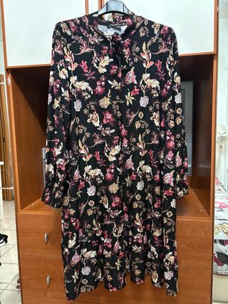 Abito da donna a maniche lunghe con stampa floreale su sfondo nero e dettagli arricciati sul spalle e maniche OVS taglia XL/52. Ha collo richiudile con lacci laterali a fiocco o come piace di più. Presenta una delicata e morbida ruches sul fondo. Vestibilità ampia e comoda, indossato ma in perfette condizioni.
