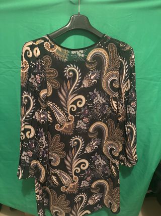Vestito con fantasia paisley su fondo nero. - Maniche lunghe. - Scollo rotondo.