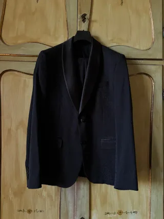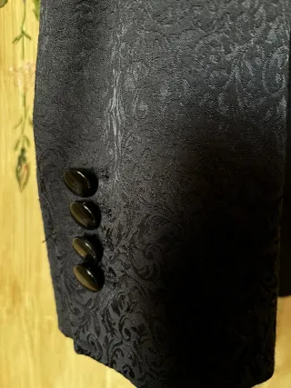 Smoking elegante di Zaraman in tessuto damascato, due pezzi da portare anche come abito da cerimonia o matrimonio e bordi in raso e bottoni gioiello, stessa cosa per i pantaloni. Mai indossato, come nuovo. La taglia della giacca e dei pantaloni è la stessa, essendo un completo unico.