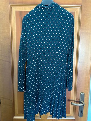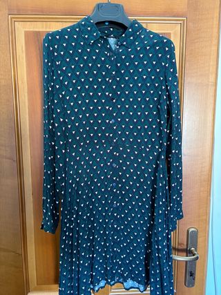 Vestito corto con una fantasia geometrica di triangoli bianchi e blu scuro su fondo verde. - Maniche lunghe. - Chiusura con bottoni. - Scollo a camicia. - Taglia M (guardare le misure in foto)
