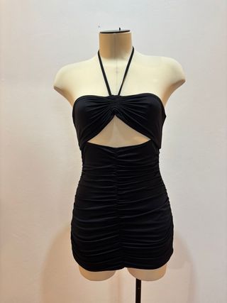 Elegante abito nero con dettagli cut-out e drappeggio. - Scollo all'americana. - Tessuto elasticizzato. - Effetto ruches sul busto e sulla gonna.