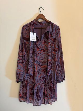 Abito Mimi-Mua Firenze con una particolare fantasia marmorea. - Maniche lunghe. - Gonna a balze. - Scollo alto.