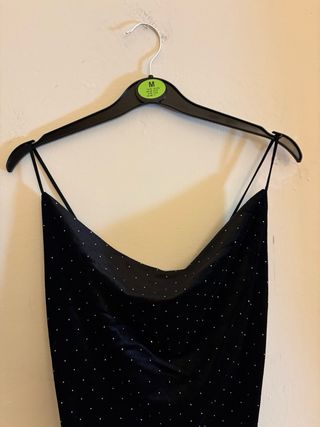 Splendido miniabito nero con scollo a cascata (cowl neck) e delicati strass argentati distribuiti su tutta la superficie. Tessuto elasticizzato (95% poliestere, 5% elastan) che si adatta perfettamente alla silhouette. Brettelline sottili regolabili. Prodotto in Italia da H&G. Con cartellino.