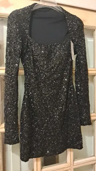 Vestito nero con brillantini. Lo scollo è morbido, le maniche sono larghe e aderenti sul fondo. Taglia XS, marca Shein. È morbido (tipo velluto). Nuovo, mai indossato. Vendo per inutilizzo.