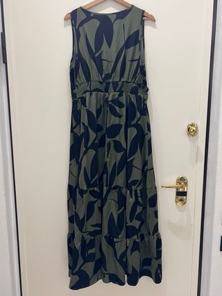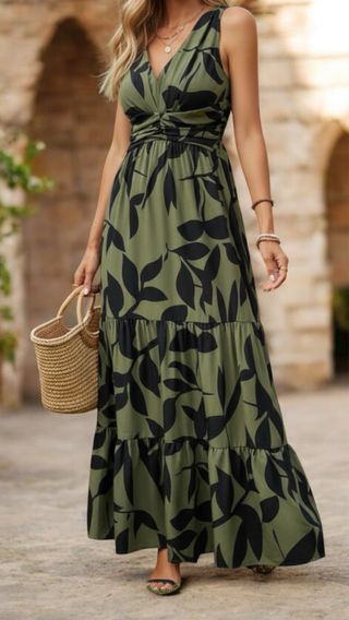Elegante vestito lungo estivo con una fantasia di foglie. Perfetto per le giornate calde. - Scollo a V incrociato. - Vita elasticizzata con dettaglio arricciato. - Gonna a balze. - Tessuto leggero e fluttuante.