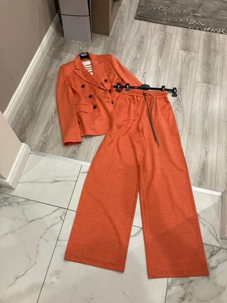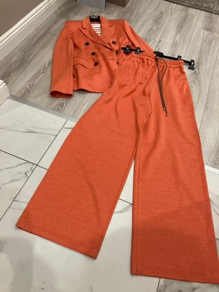 Elegante tailleur composto da giacca e pantaloni. - Giacca doppiopetto con bottoni. - Pantaloni a palazzo con coulisse. Misto lino e cotone Ettichetta del brand parzialmente tagliata