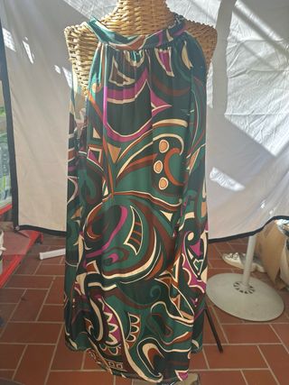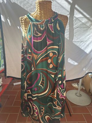 Elegante vestito modello Pucci con una stampa vivace e colorata. - Design senza maniche. - Scollo alto. - Tessuto fluido e leggero.
