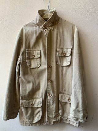 Giacca stile sahariana Ruben Wood. - Colore beige. - Chiusura con bottoni. - Collo alto con chiusura a bottone. - Quattro tasche frontali con patta e bottone. Misure: Torace (da ascella ad ascella): 55 cm Lunghezza manica: 65cm Spalla: 48cm Lunghezza busto: 80cm