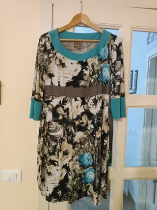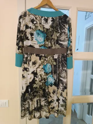 Elegante vestito con una stampa floreale vivace e dettagli in turchese. Realizzato in Italia. Spalle 41 cm da se l'asse la 46 cm lunghezza 90 cm esterno 100% poliestere interno poliamide - Scollo rotondo con bordo turchese. - Fascia in vita con dettagli scintillanti. - Maniche a 3/4 con polsini turchesi. - Applicazione floreale sul petto.