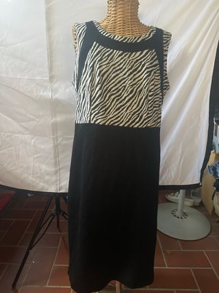 Elegante vestito con fantasia a zebra e inserti neri. - Fantasia a zebra sul busto. - Parte inferiore e inserti neri. - Senza maniche.