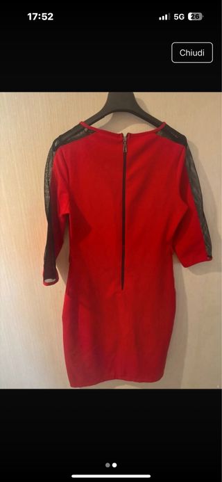 Elegante vestito corto con maniche a tre quarti. - Tessuto principale rosso. - Inserti in pizzo nero sulle spalle e maniche. - Scollo a V con zip centrale.