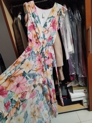 Bellissimo abito lungo a fiori, perfetto per le occasioni speciali. - Georgette leggero e fluido - Stampa floreale multicolor - Volant sulle spalle - Lunghezza asimmetrica