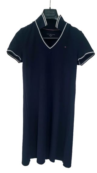 Vestito corto da donna Tommy Hilfiger. - Scollo a V con bordi bianchi. - Maniche corte con bordi bianchi. - Piccolo logo sulla parte anteriore. Elegante abito polo blu scuro con dettagli bianchi sul colletto e sulle maniche. Taglio classico e comodo, perfetto per un look casual ma curato. In ottime condizioni, indossato pochissimo. Taglia S. Misure lunghezza dal collo: 92 cm Lunghezza dall’ascella: 67 cm Torace: 38 cm Taglia S / IT 40 / EU 36