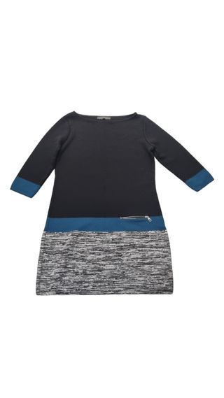 Elegante abito Sandro Ferrone con un design moderno. - Scollo a barca. - Parte inferiore a fantasia mélange. Abito donna a maniche lunghe, fantasia blu e grigia, tessuto morbido e confortevole, ideale per l'autunno/inverno. Vestibilità regular, dettaglio zip laterale decorativa. In ottime condizioni, perfetto sia per il lavoro che per il tempo libero. Scrivimi per altre foto o info. misure lunghezza dal collo 79 cm, lunghezza dall’ascella 61 cm torace 45,5 cm. Taglia L / IT 44 / EU 40