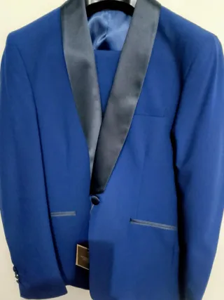 Elegante smoking da uomo di colore blu, perfetto per occasioni speciali. - Revers a scialle in raso blù - Chiusura con un bottone. - Tasche a filetto. - Fodera interna blu. - Polsini con bottoni.
