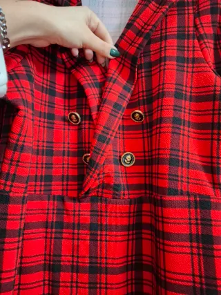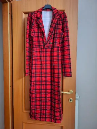 Bellissimo abito a tubino firmato SHEIN, caratterizzato dalla classica ed intramontabile fantasia tartan (scozzese) nei toni del rosso e del nero. Modello aderente con maniche lunghe, con scollo raffinato a revers (stile giacca) incrociato a V. Ha quattro bottoni gioiello neri con cornice dorata. Taglia: L (corrisponde a una 44/46 italiana o 40/42 EU). Materiale: 97% Poliestere, 3% Elastane. Condizioni ottime, indossato pochissimo. 📦 Spedizione rapida. Sono disponibile per qualsiasi info o foto extra!