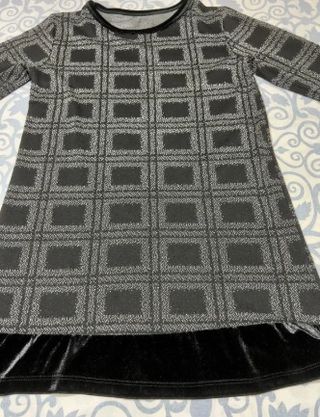 Vestito morbido con fantasia a quadri. - Maniche a 3/4. - Fondo in velluto nero. - Scollo rotondo con bordo nero.