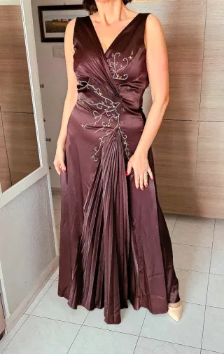 Abito lungo di alta eleganza, perfetto per serate speciali. - Tessuto satinato color marrone. - Dettagli ricamati sul corpetto. - Gonna con pieghe piatte. - Scollo a V.