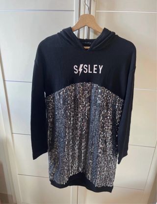 Vestito felpa lungo con un design moderno e accattivante. - Parte superiore nera con cappuccio. - Ampia fascia frontale ricoperta di paillettes argentate. - Maniche lunghe. taglia : 13/14 anni (3XL da cartellino), ma veste fino ad una L donna. Per misure scrivere in privato.