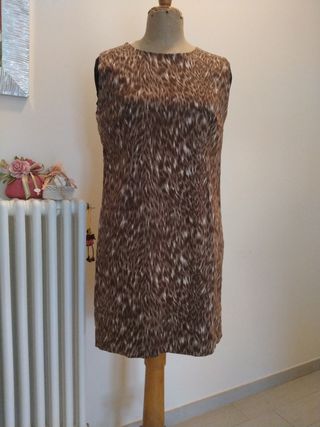 Tubino invernale e foderato in fustagno, fatto a mano. Fantasia maculata. Misure: giro seno, 100 cm giro vita, 91 cm giro fianchi, 104 cm lunghezza, 94 cm