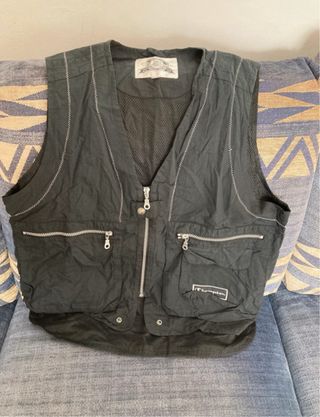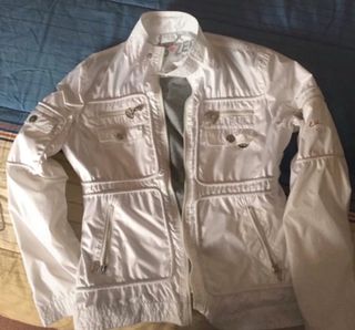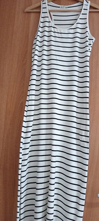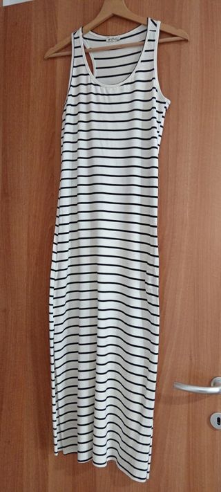 Bianco con righe blu, senza maniche spacchi laterali, elasticizzato veste S/M. Indossato in passato ma è troppo che sosta nel mio armadio. Vendo perché non lo uso.