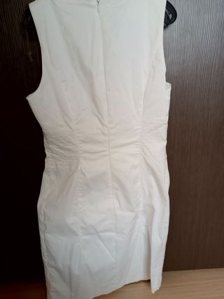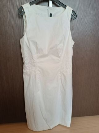 Vestito a tubino Benetton in cotone 100% , taglia 44 italiana, colore bianco panna, smanicato, chiuso da zip lunga sul retro. Indossato solo due ore per una cerimonia. È completamente foderato internamente quindi non trasparente. Perfetto per l'estate!