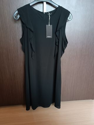 Abito nero Motivi nuovo, mai indossato, con cartellino attaccato. Taglia 44 italiana. Tessuto leggero, con rouches sul davanti. Elegante e completamente foderato, non trasparente. Lunghezza al ginocchio. Chiuso con zip sul retro. Acquistato a 69.90 euro.