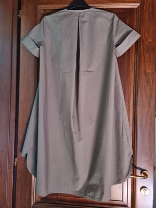 Miniabito verde salvia più corto sul davanti e a scivolo verso il dietro. Mai usato per un grossolano errore di taglia