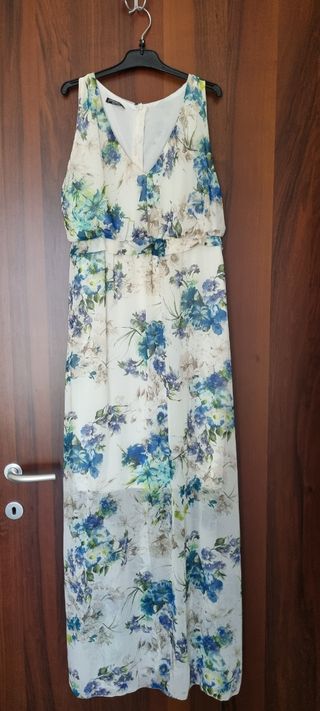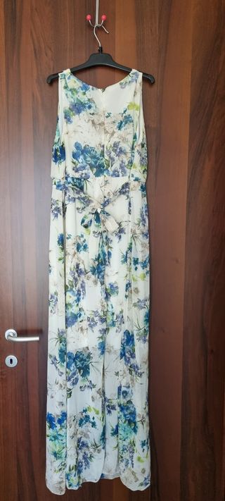 Bellissimo vestito lungo estivo, ideale per cerimonie o occasioni speciali. - Vestito lungo a fiori - Colore bianco e blu - Tessuto leggero e fluido - Perfetto per la primavera/estate