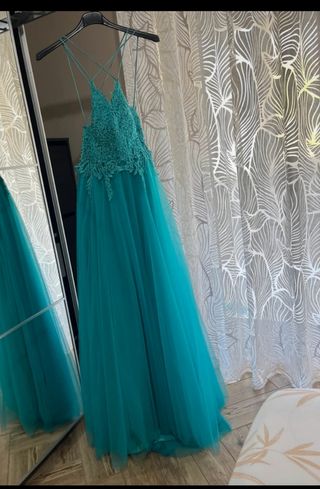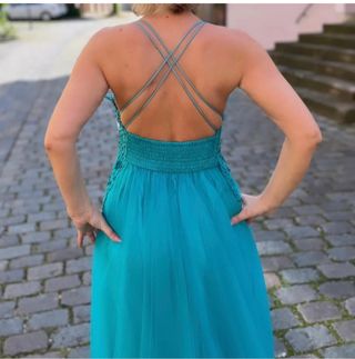 Bellissimo vestito lungo da cerimonia, perfetto per un'occasione speciale. - Colore verde acqua/turchese - Tessuto tulle - Dettagli in pizzo - Scollo a V e schiena scoperta - Perfetto per matrimoni, eventi formali o serate eleganti nuovo senza cartellino prezzo in negozio 220€