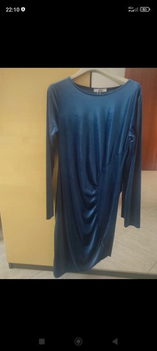 Elegante tubino in velluto blu elettrico. - Tessuto morbido e luminoso. - Maniche lunghe. - Dettaglio drappeggiato sul fianco.